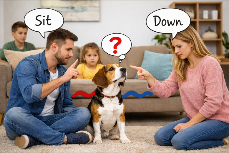 If you say “Sit” and someone else says “Down,” your dog will get confused.